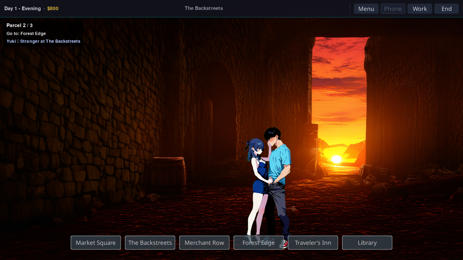 - Make hard choices — Working earns money but leaves someone exposed. Dates take time you might need elsewhere. Every action has a trade-off.